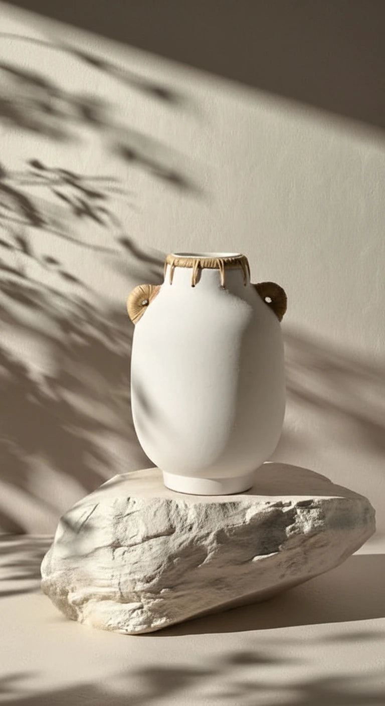 The Usiris Vase reflects timeless simplicity — clean lines, natural tone, and material honesty. The rattan detail softens the ceramic form, creating a piece that feels organic yet structured, contemporary yet rooted.